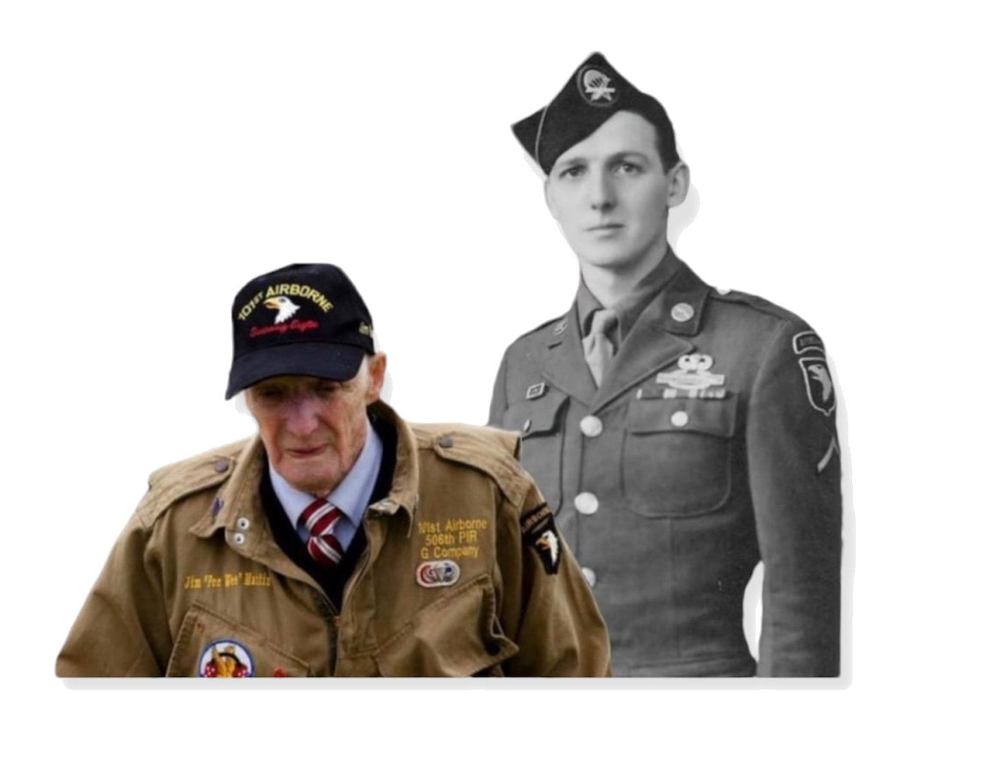 Under the leadership of Colonel Robert Sink, commander of the 506th Parachute Infantry Regiment, 101st Airborne Division, Jim Martin joined the most elite unit in the United States Airborne in 1942 during World War II. Being the most lightweight member of the now famous 506th PIR not only dubbed him the nickname “Pee Wee,” he is also prestigiously known as one of Colonel Sink’s original Toccoa men.